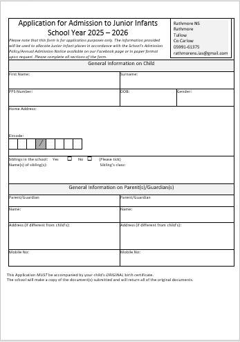 The school will be accepting applications for admission for the 2025/ 2026 year from 25/10/2024 to 15/11/2024. If you would like to submit an application forms are available on request by emailing rathmorens.ias@gmail.com or by writing to